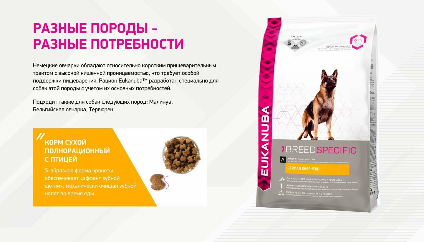 Купить Eukanuba корм для взрослых собак породы Немецкая овчарка, курица 10 кг