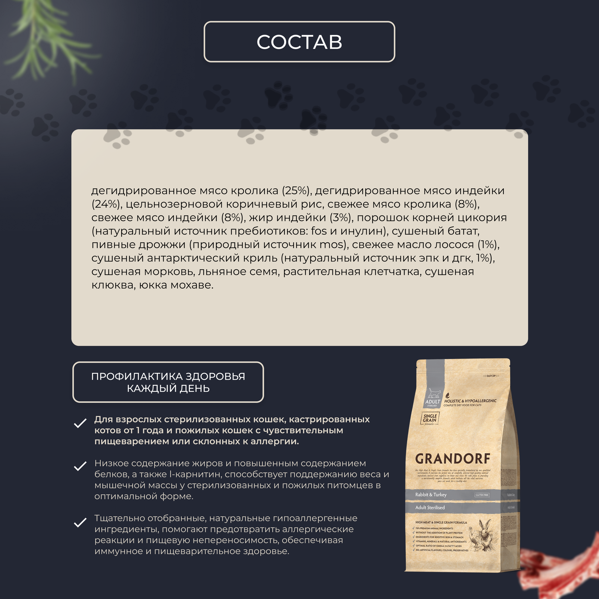 Корм для кошек GRANDORF Кролик с индейкой Sterilised 2кг. Для взрослых стерилизованных или пожилых кошек от 1 года. С пробиотиками, низкозерновой.