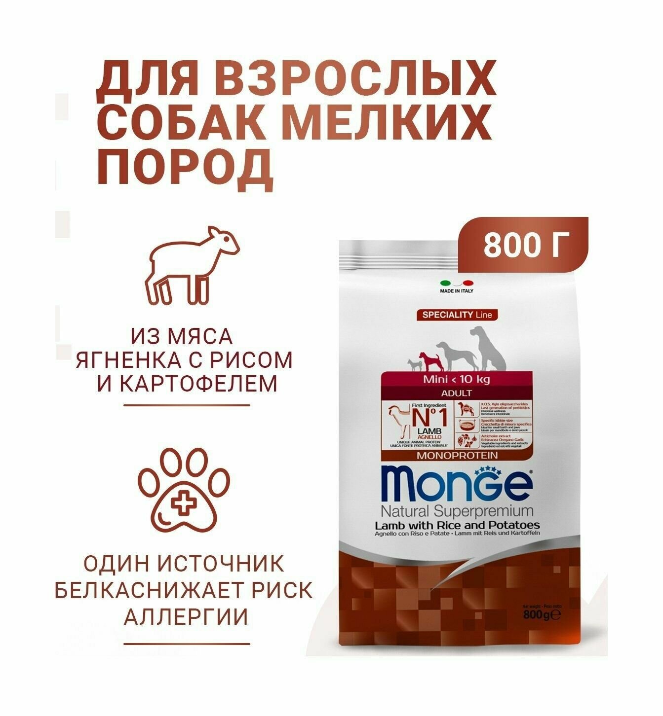 Monge Dog Monoprotein Mini корм для взрослых собак мелких пород ягненок с рисом и картофелем 800г