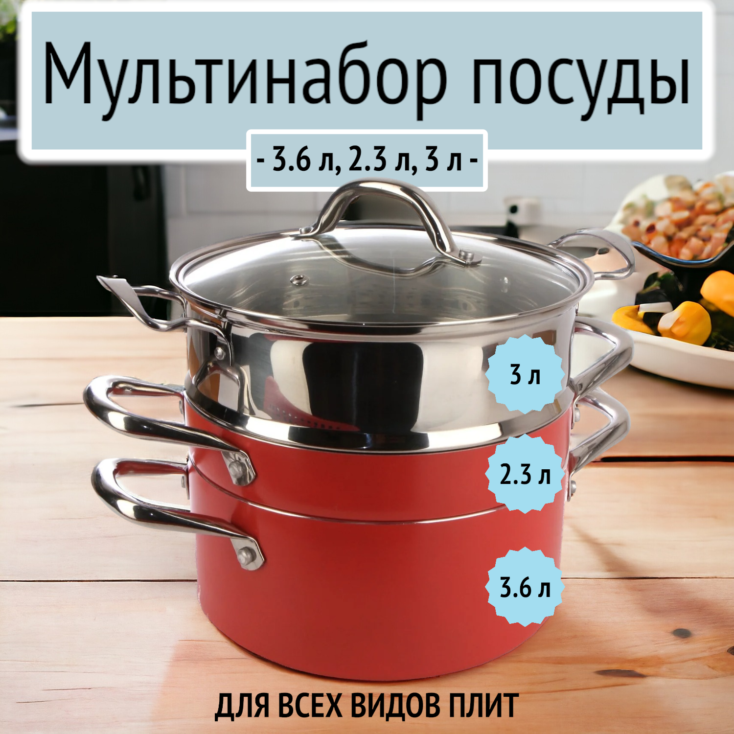| Комплектация | кастрюля: 3.6 л; сотейник: 22 см, пароварка 22 см; крышка |