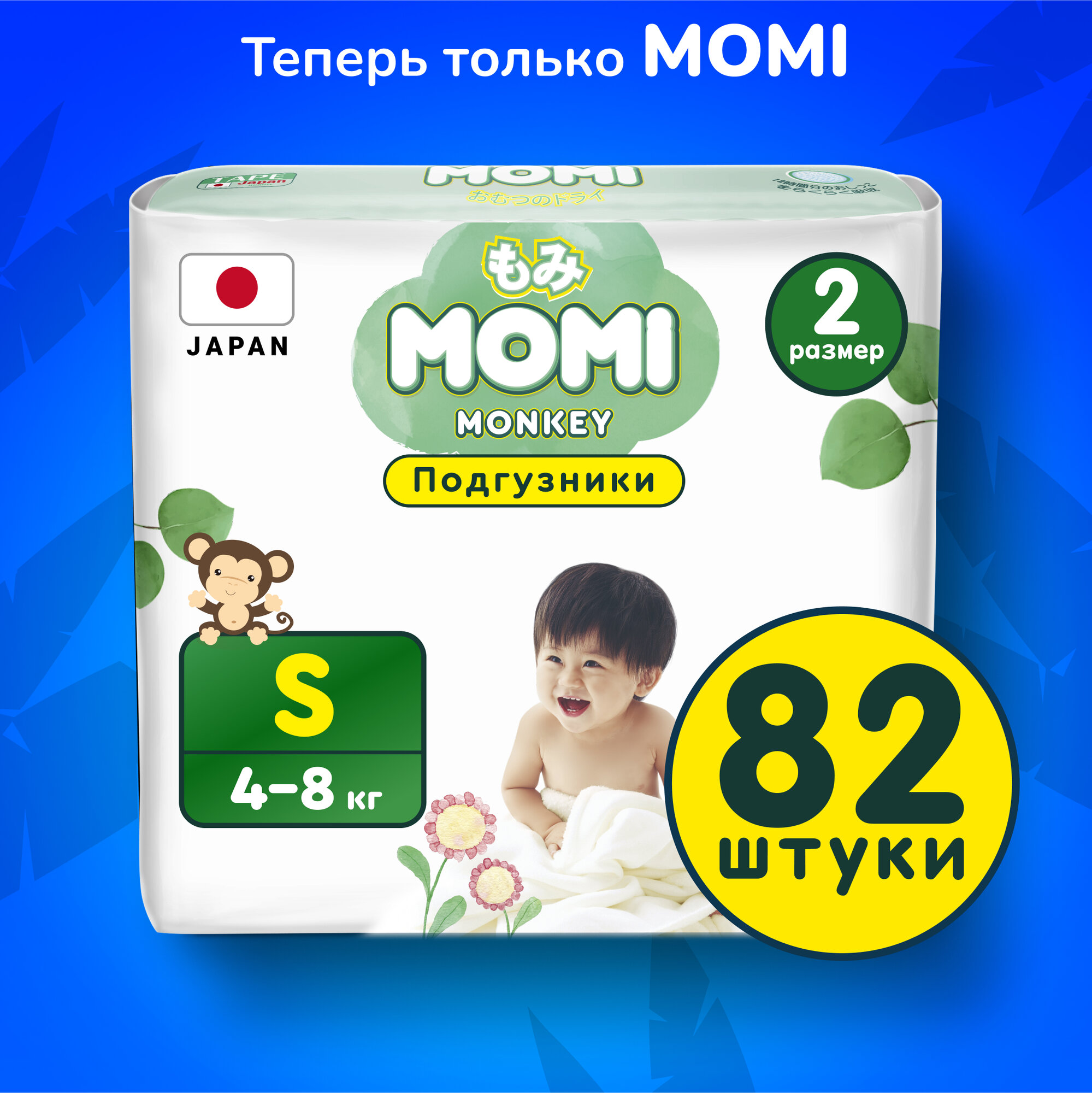 Momi Подгузники детские, 4-8 кг/ размер 2 S, 82 шт, MONKEY