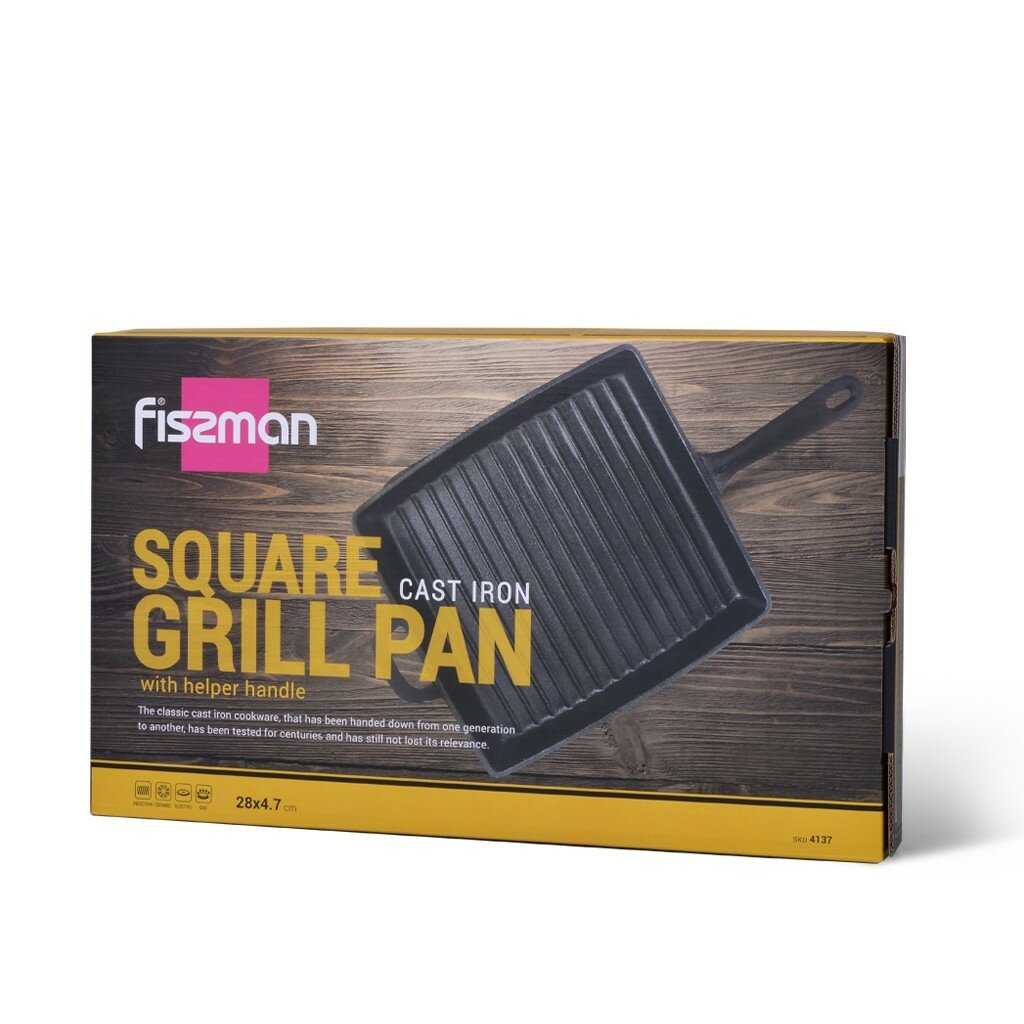 4137 FISSMAN Сковорода-гриль 28х4,7см квадратная с вспомогательной ручкой (чугун) Ручка-чугун; Индукция