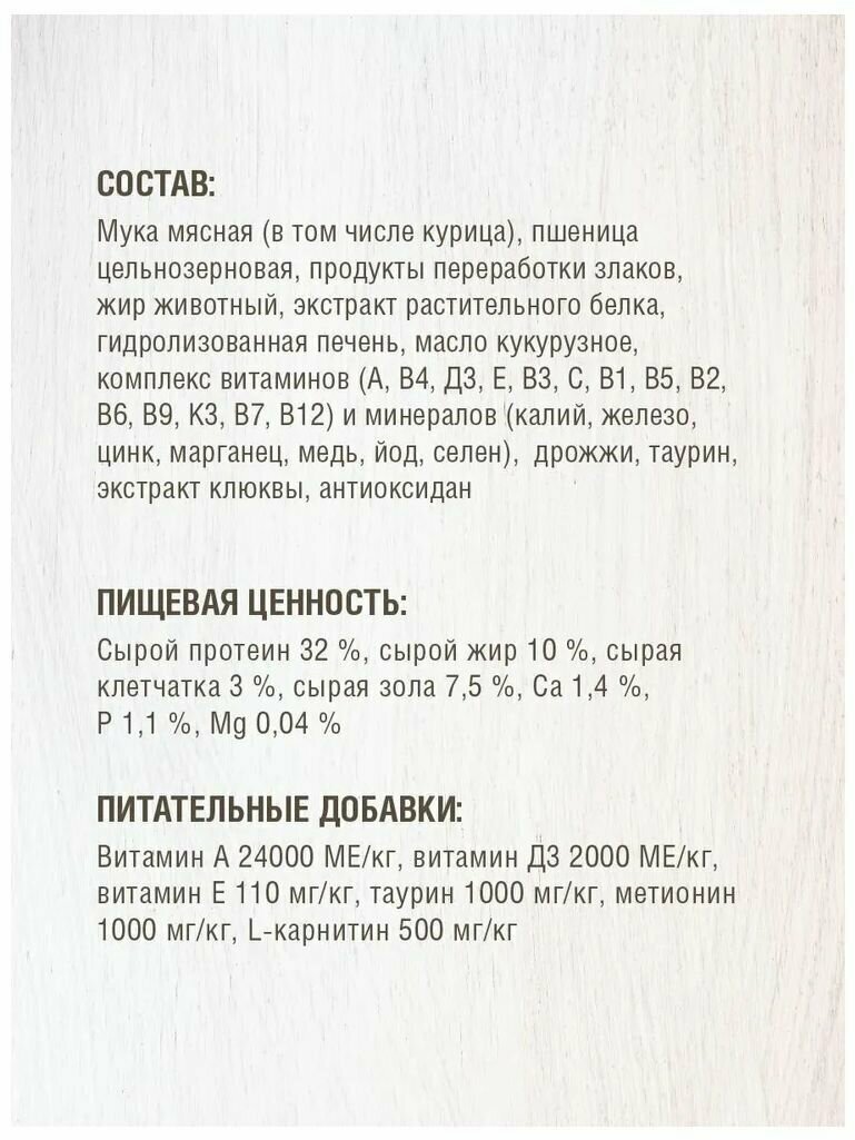 | Состав | мука мясная (в том числе курица), пшеница цельнозерновая, продукты переработки злаков, жир животный, экстракт растительного белка, гидролизованная печень, масло кукурузное, комплекс витаминов (А, В4, Д3, Е, В3, С, В1, В5, В2, В6, В9, К3, В7, В12) и минералов (калий, железо, цинк, марганец, медь, йод, селен), дрожжи, таурин, экстракт клюквы, антиоксидант |