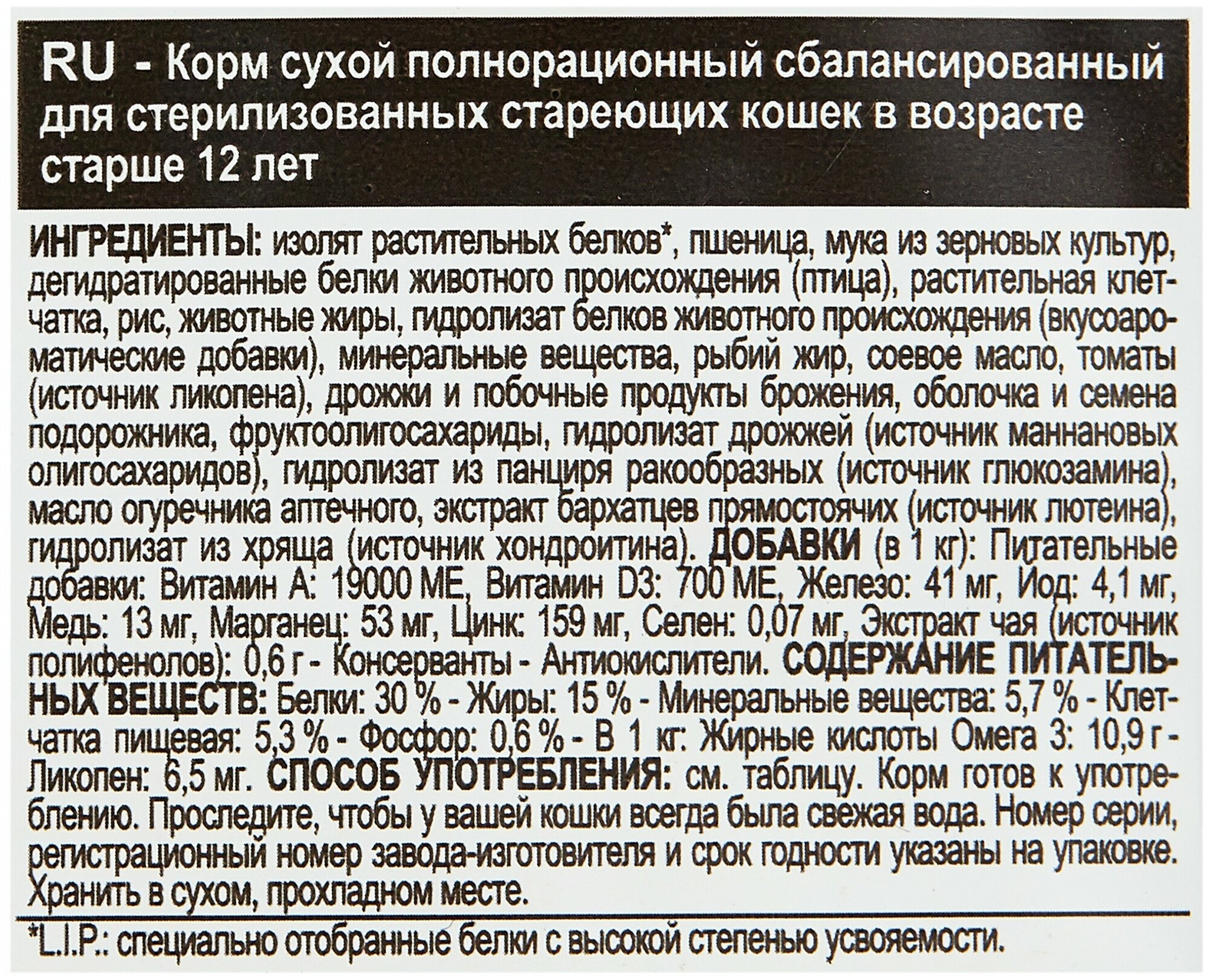 | Состав | изолят растительных белков, пшеница, мука из зерновых культур, дегидратированные белки животного происхождения (птица), растительная клетчатка, рис, животные жиры, гидролизат белков животного происхождения (вкусоароматические добавки), минеральные вещества, рыбий жир, соевое масло, томаты (источник ликопина), дрожжи и побочные продукты брожения, оболочка и семена подорожника, фруктоолигосахариды, гидролизат дрожжей (источник мaннановых олигосахаридов), гидролизат из панциря ракообразных (источник глюкозамина), масло огуречника аптечного, экстракт бархатцев прямостоячих (источник лютеина), гидролизат из хряща |