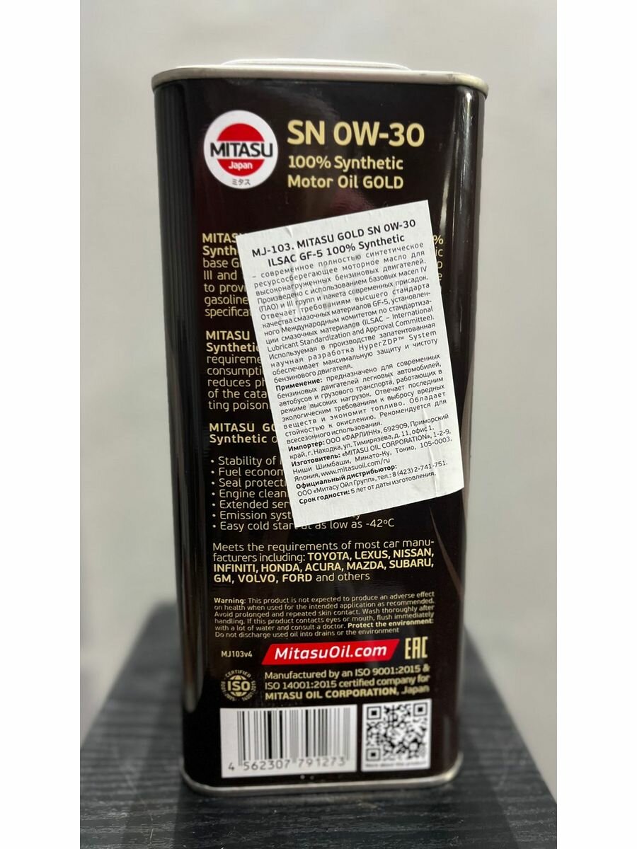 Синтетическое моторное масло Mitasu MJ-103 Gold PAO SN 0W-30, 1 л