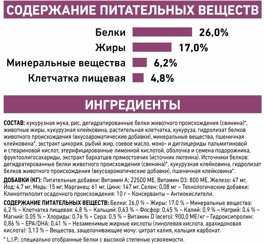 | Состав | кукуруза, пшеничная клейковина, кукурузная мука, пшеница, кукурузная клейковина, животные жиры, дегидратированные белки животного происхождения (птица), растительная клетчатка, рис, гидролизат белков животного происхождения (вкусоароматические добавки), экстракт цикория, минеральные вещества, рыбий жир, соевое масло, дегидратированная томатная пульпа (источник ликопена), оболочка и семена подорожника, фруктоолигосахариды (0,5 %), мука из мякоти новозеландского зеленогубого моллюска (GLM 0,3 %), гидролизат дрожжей (источник мaннановых олигосахаридов) (0,2 %), масло огуречника аптечного, глюкозамин, полученный путем ферментации, экстракт бархатцев прямостоячих (источник лютеина), гидролизат из хряща (источник хондроитина). |