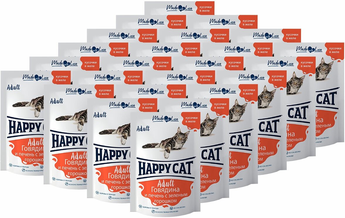 Купить Паучи Happy Cat Хэппи Кэт для кошек любых пород, говядина печень горох в желе (24шт х 100гр)