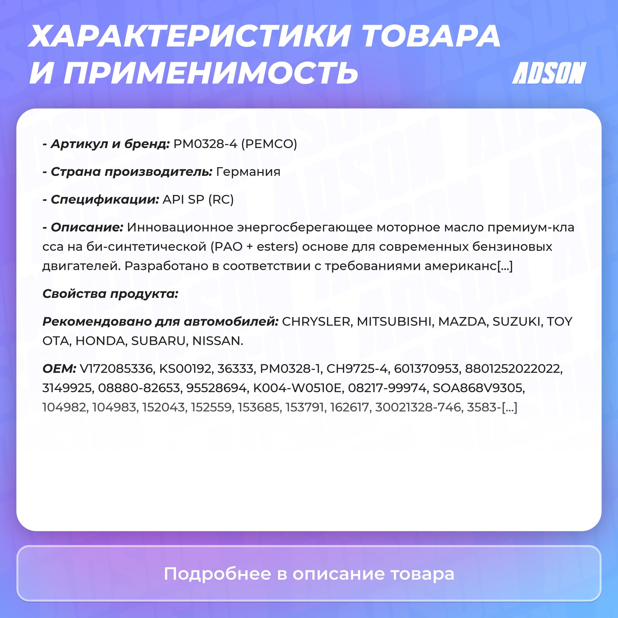 0W-20 SP RC C5 4л (PAO синт. мотор. масло) PEMCO PM0328-4 интересное:
