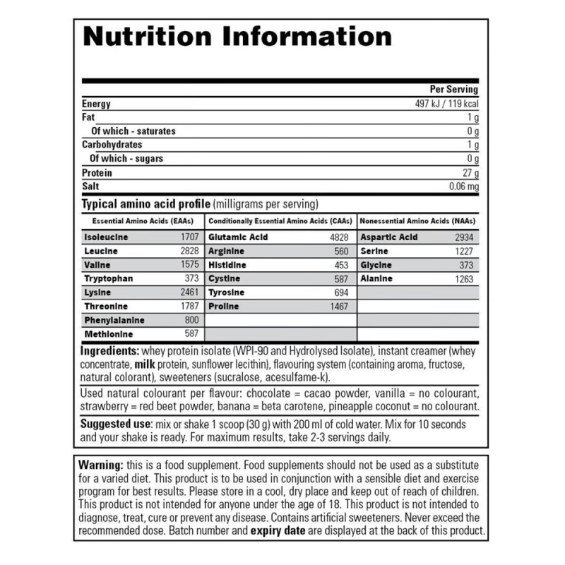 | Состав | изолят сывороточного белка (WPI-90 и гидролизованный изолят), сывороточный концентрат, молочный белок, пальмовое масло, соевый лецитин, ароматизаторы (фруктоза, натуральный краситель), подсластители (сукралоза, ацесульфам-К) |