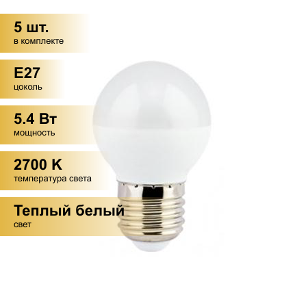 (5 шт.) Светодиодная лампочка Ecola шар G45 E27 5.4W 2700K 2K 89x45 (5W) Premium K7QW54ELC интересное: