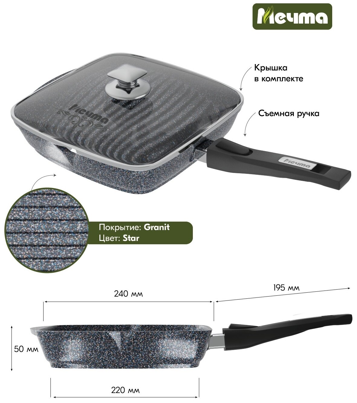 Сковорода гриль Мечта квадратная 24х24 см Гранит с антипригарным покрытием со съемной ручкой и крышкой, НЕ индукционная