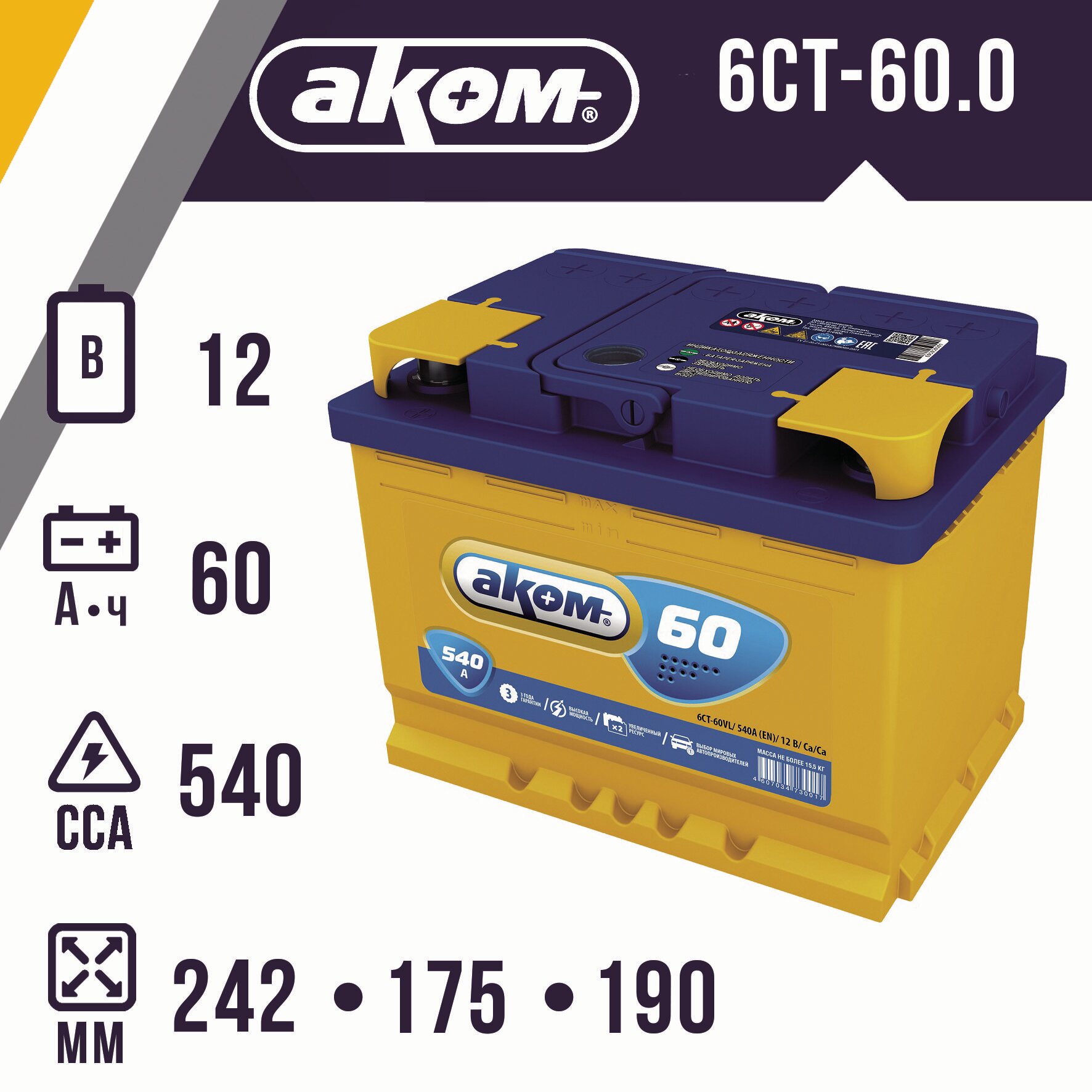 AKOM 6CT-60.0 LA Аккумуятор АКОМ 60 А/ч Обратная R+ 242x175x190 EN540 А