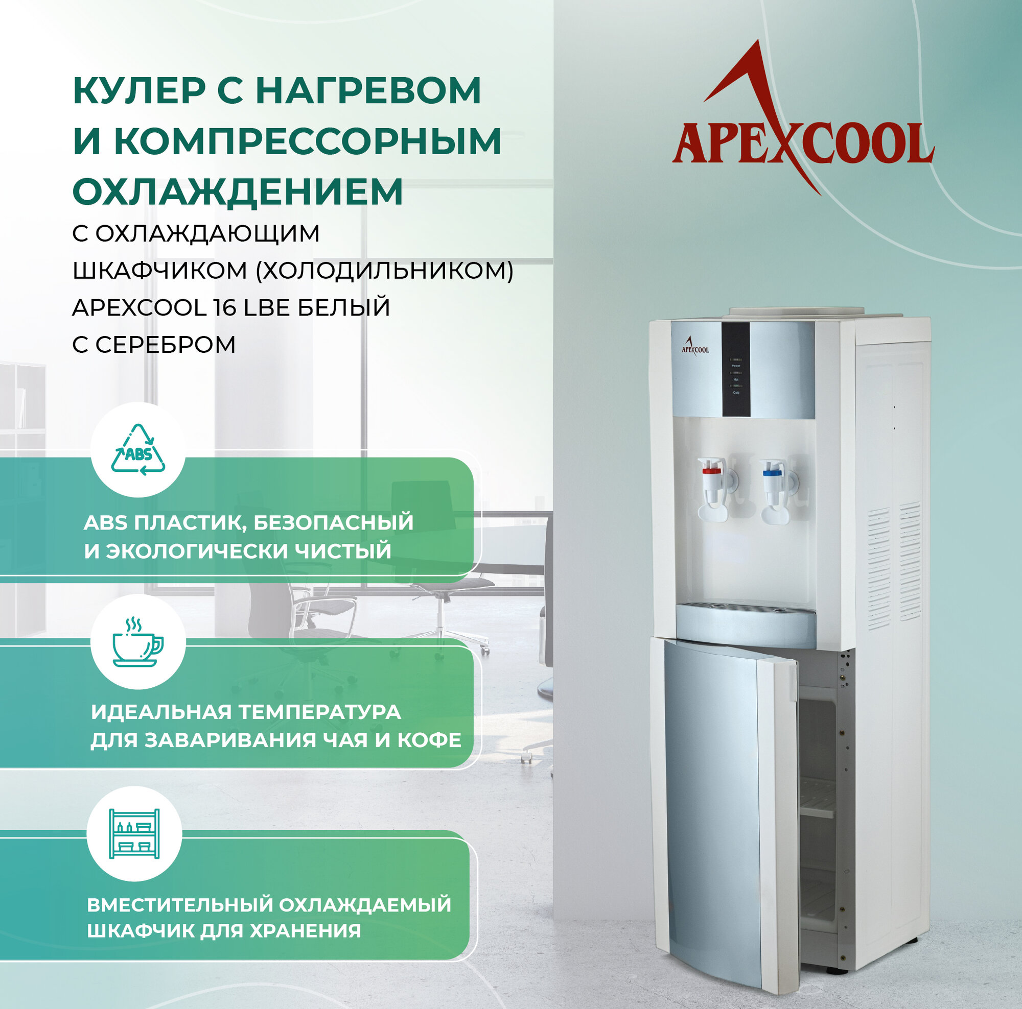 Кулер для воды с холодильником APEXCOOL 16LBE белый с серебром интересное:
