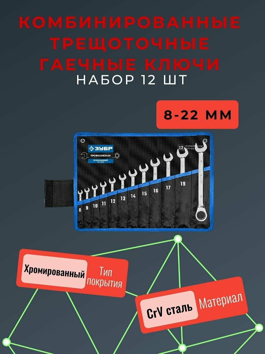 ЗУБР 12 шт, 8-22 мм, Набор комбинированных трещоточных гаечных ключей, Профессионал (27075-H12)