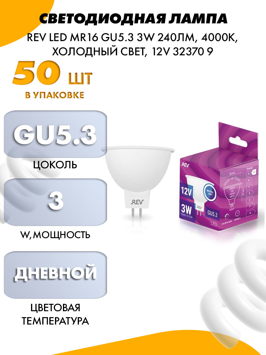 Лампа светодиодная MR16 GU5.3 3W 4000K холодный свет 12V REV 32370 9 интересное:
