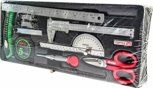 Набор измерительного инструмента ножницы, рулетка, щуп, штангенциркуль, транспортир, линейка универсальный 11 предметов 434х176мм GCAT1101 TOPTUL интересное: