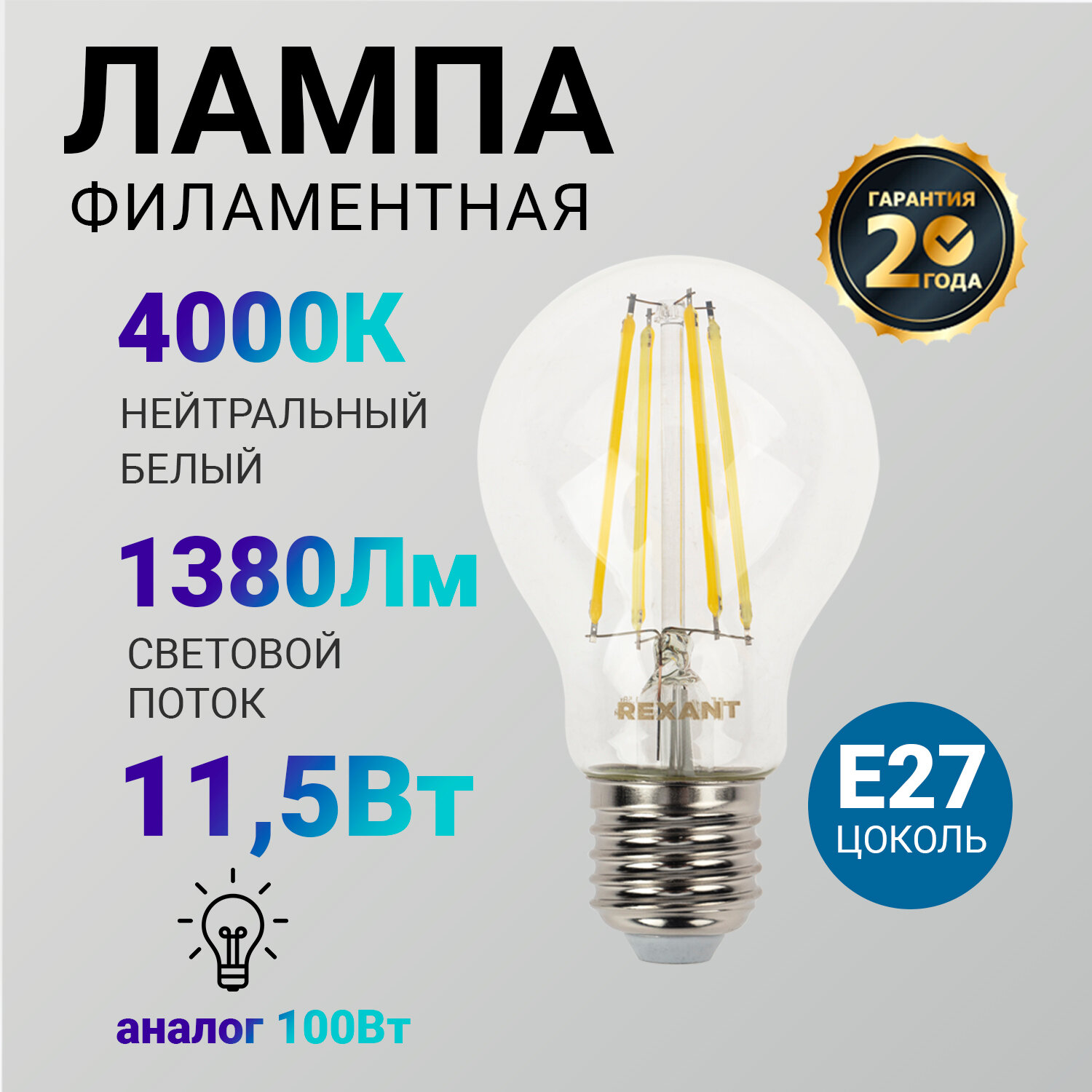 Купить Лампочка филаментная REXANT Груша A60 11.5 Вт 1380 Лм 4000K E27 прозрачная колба
