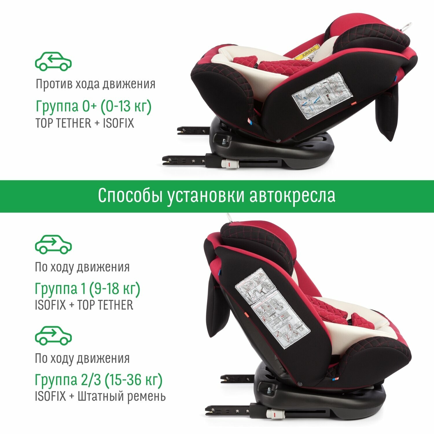 | Особенности установки | фиксатор натяжения штатного ремня / якорный ремень / поворотный механизм |
