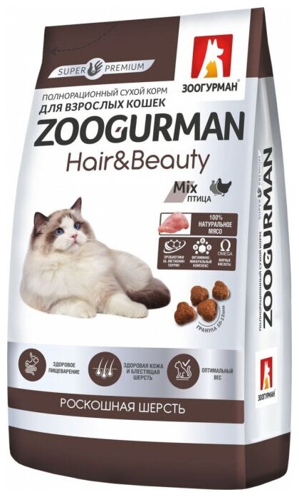 Корм Зоогурман Hair & Beauty Mix для кошек, уход за шерстью и кожей, с птицей, 1.5 кг