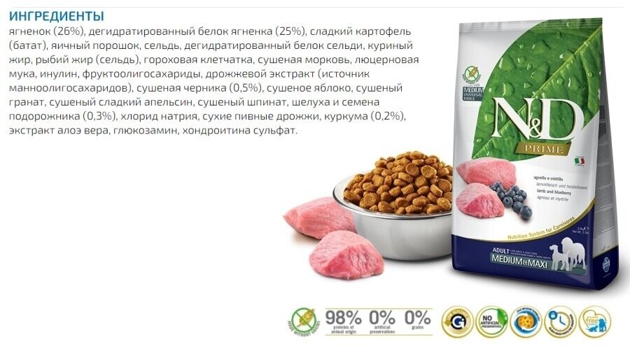 Farmina Сухой корм N&D Prime Dog Grain Free Lamb & Blueberry Adult Medium & Maxi беззерновой для взрослых собак крупных и средних пород с ягненком и черникой ,2,5 кг