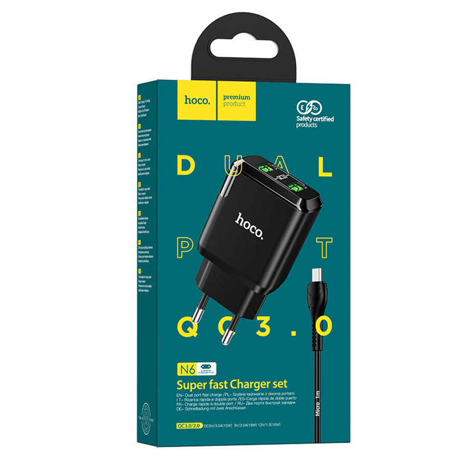 Блок питания сетевой 2 USB HOCO N6, Charmer, 3.0A, QC3.0, с кабелем микро USB, 1.0м, поликарбонат, 18W, цвет: черный