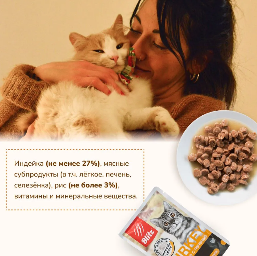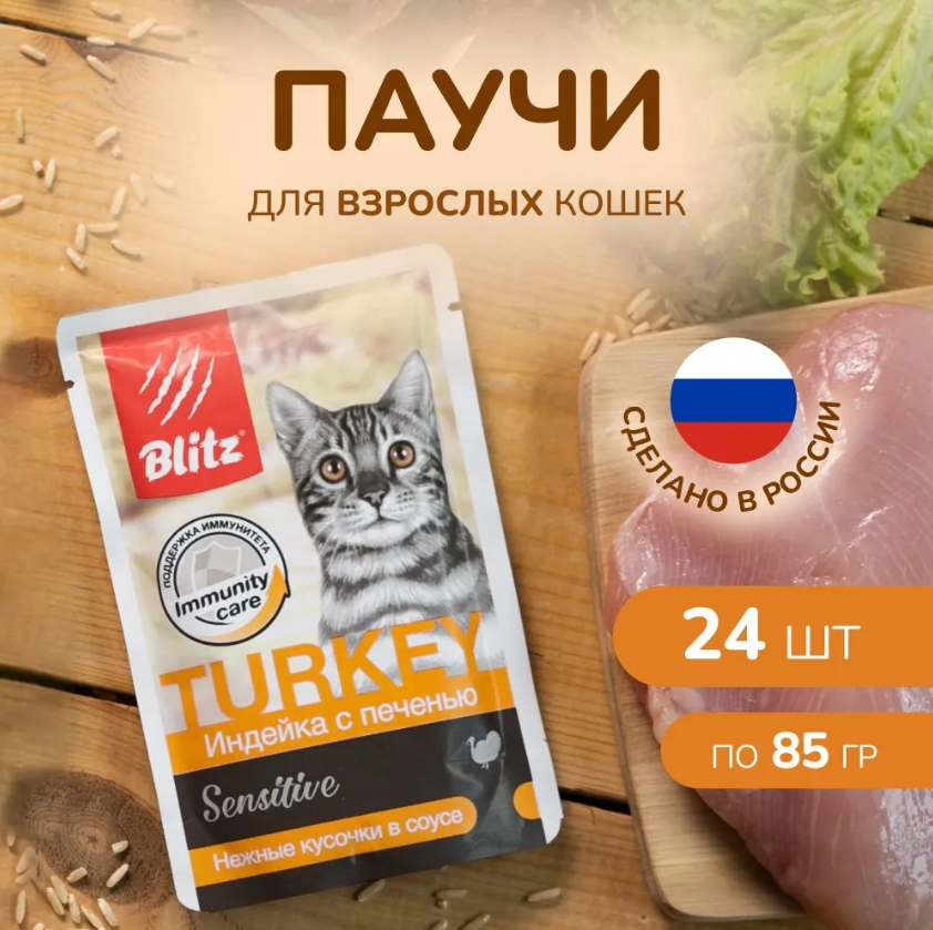 Консервы BLITZ для кошек Индейка с Печенью в соусе пауч 85г (24 шт. в упаковке)