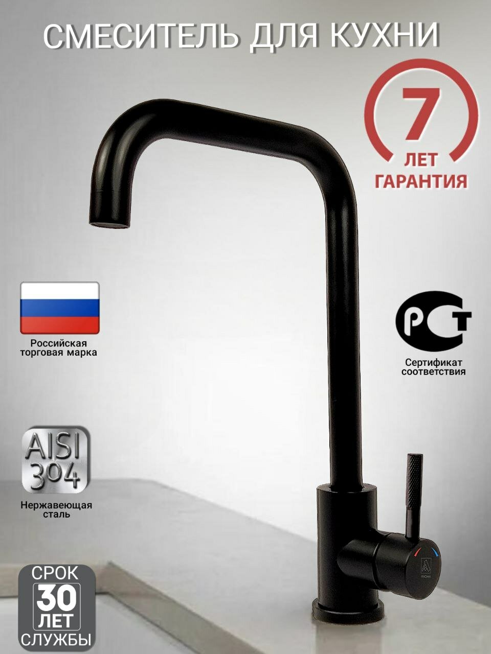 Смеситель для кухонной мойки ARGO SOLID 35-08 высокий поворотный излив, черный