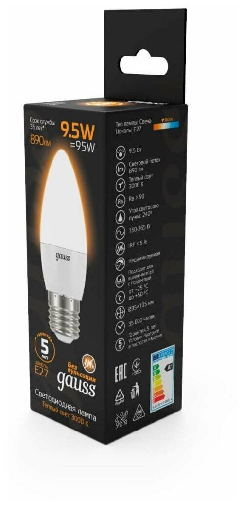 Упаковка ламп LED GAUSS E27, свеча, 9.5Вт, 3000К, белый теплый, 10 шт. [103102110]