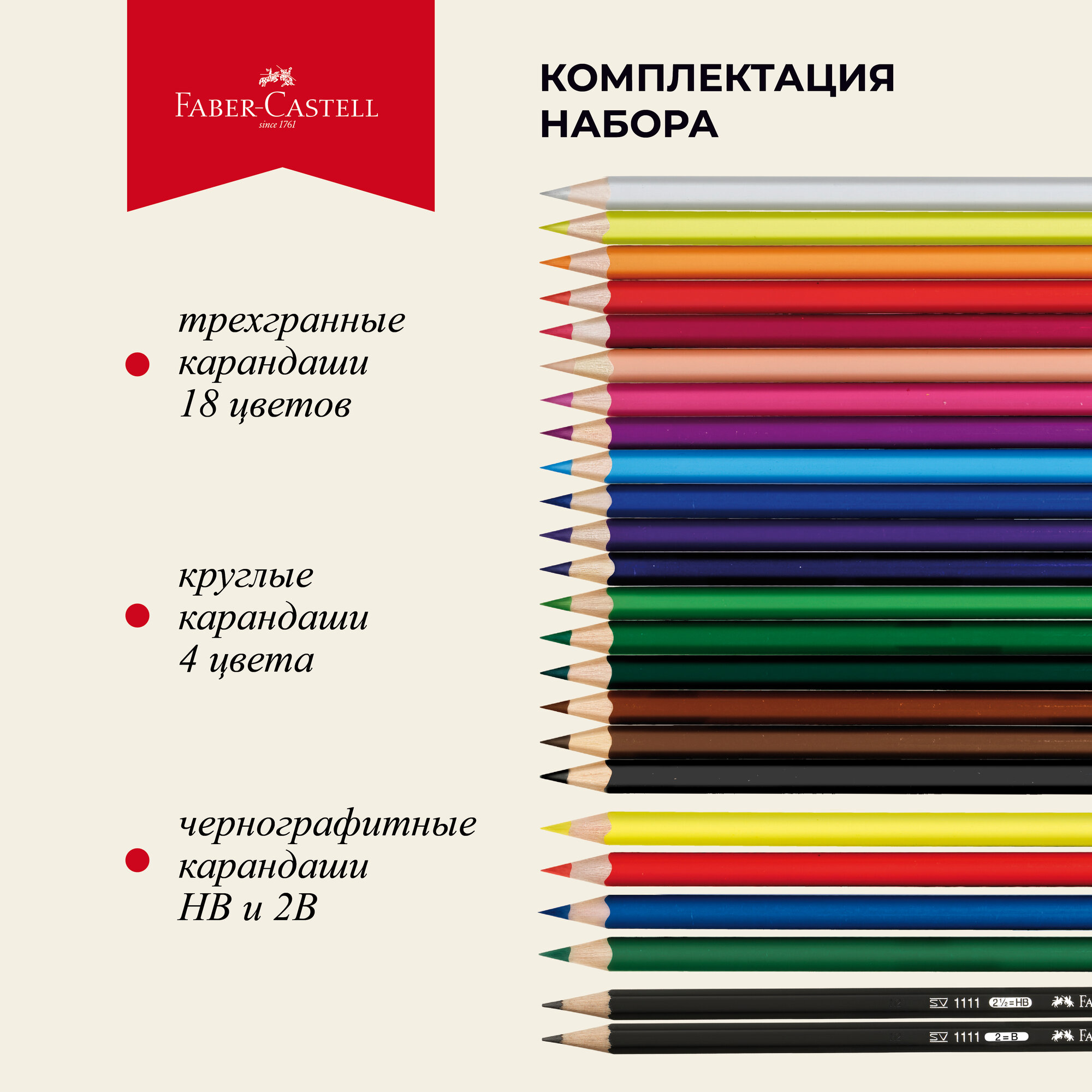 | Подробная комплектация | 18 цветных карандашей в трехгранном корпусе; 4 цветных карандаша в круглом корпусе; 2 чернографитных карандаша в шестигранном корпусе |
