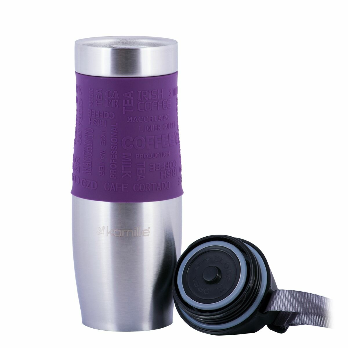 Термокружка Kamille с TPR-вставкой и ремешком (фиолетовая) 480 мл (2051)