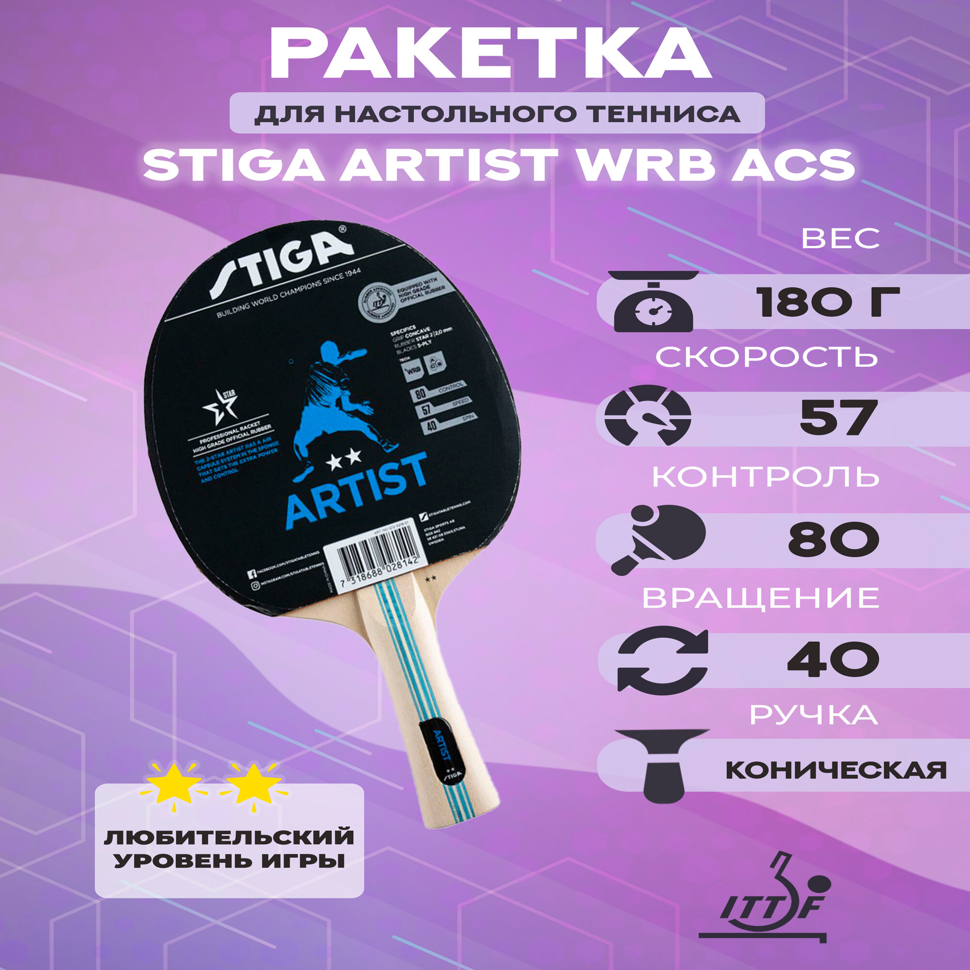 Ракетка для настольного тенниса Stiga Sports Stiga Artist WRB ACS, 1212-6218-01, для начинающих, одобренная ITTF накладка с губкой толщиной 2 мм, пятислойное основ