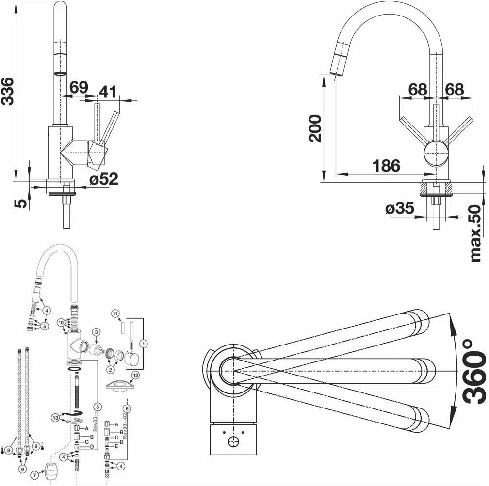 | Высота излива | 200 мм / 336 мм |