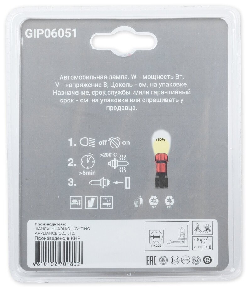GANZ GIP06051 Лампа 12V H3 100W +50% PK22s 5000K GANZ 2 шт. блистер GIP06051