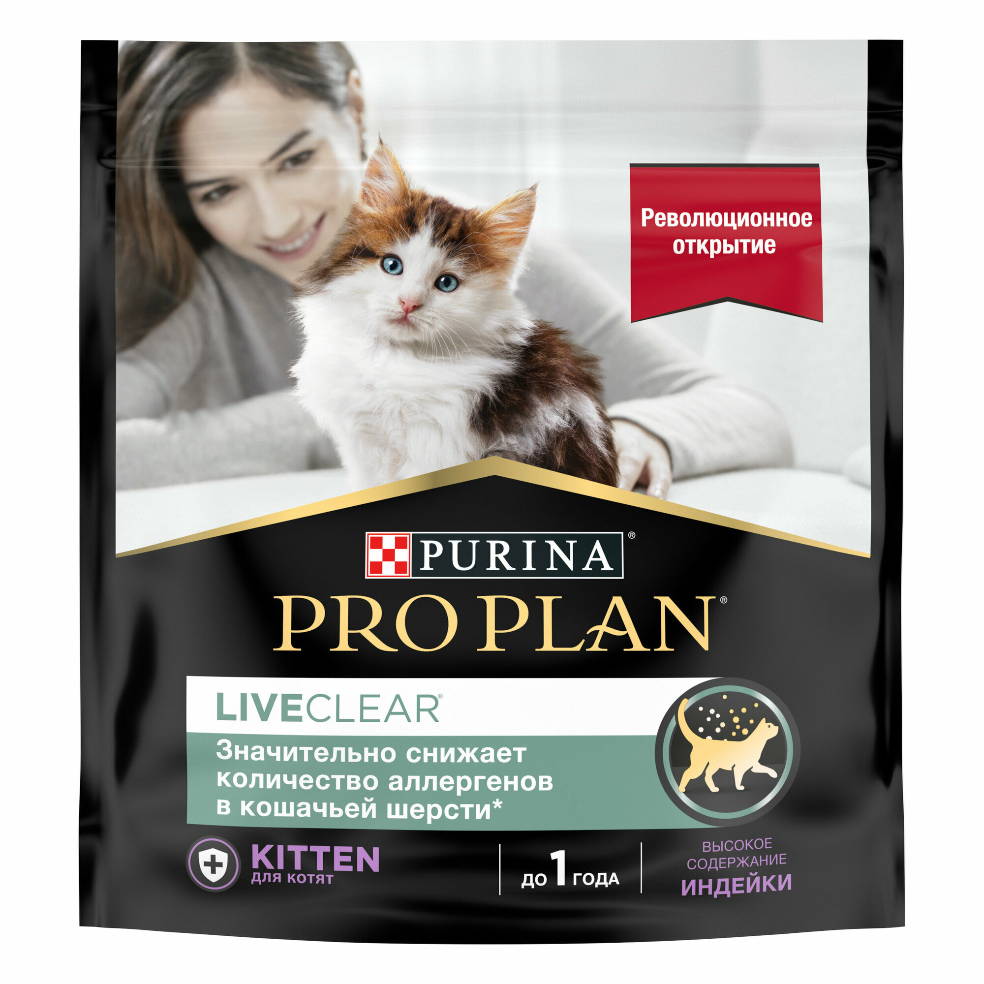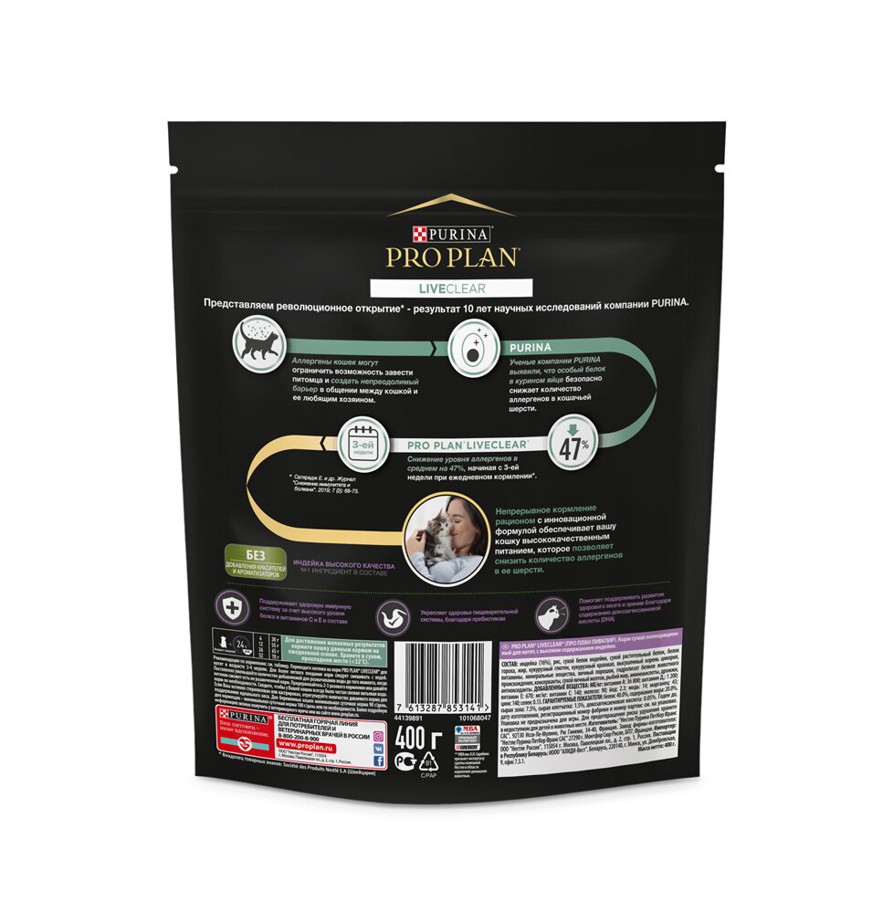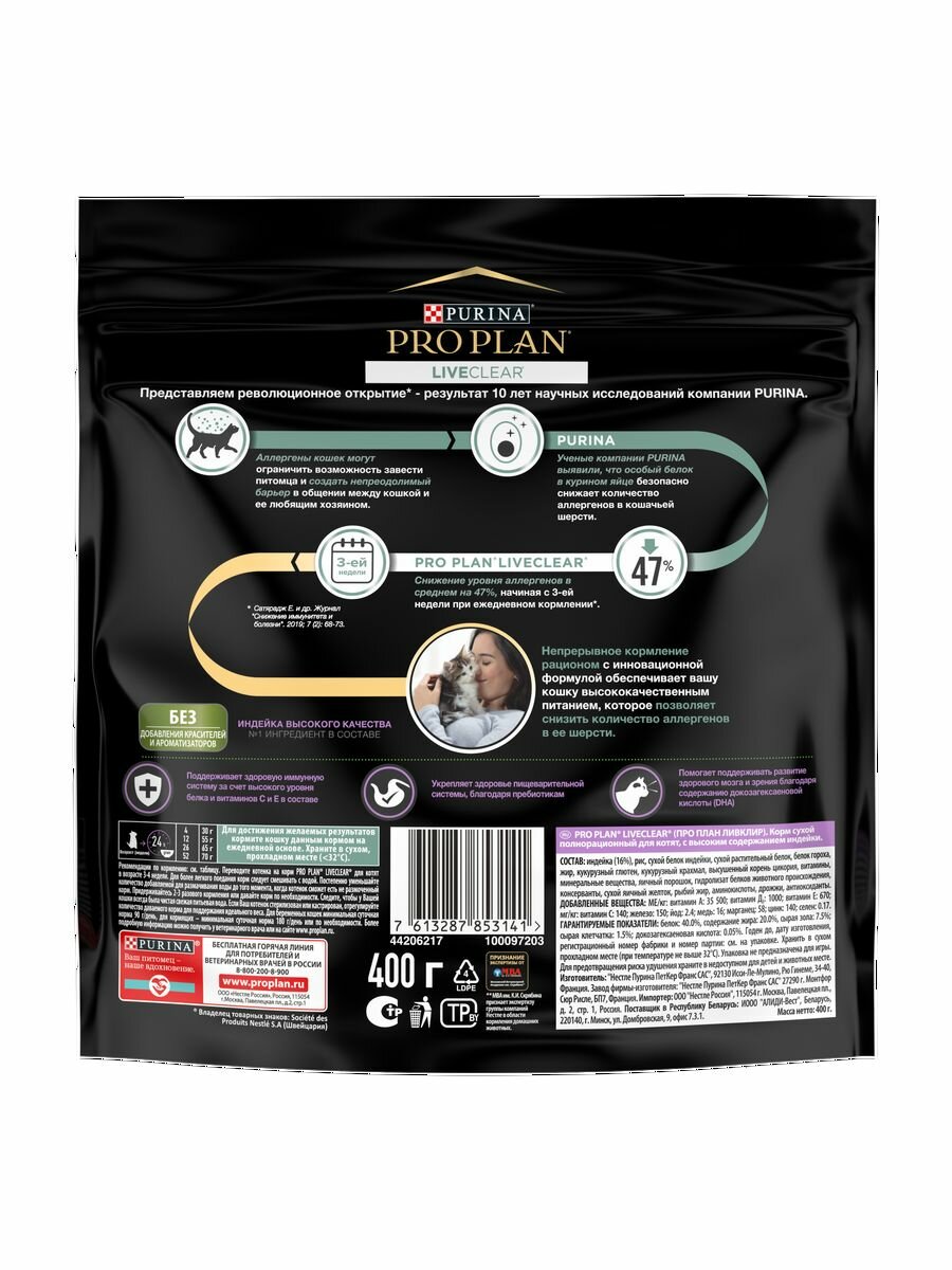 Сухой корм Pro Plan® LiveClear® для котят до 1 года, снижает количество аллергенов в шерсти, с высоким содержанием индейки, Пакет, 0,4 кг