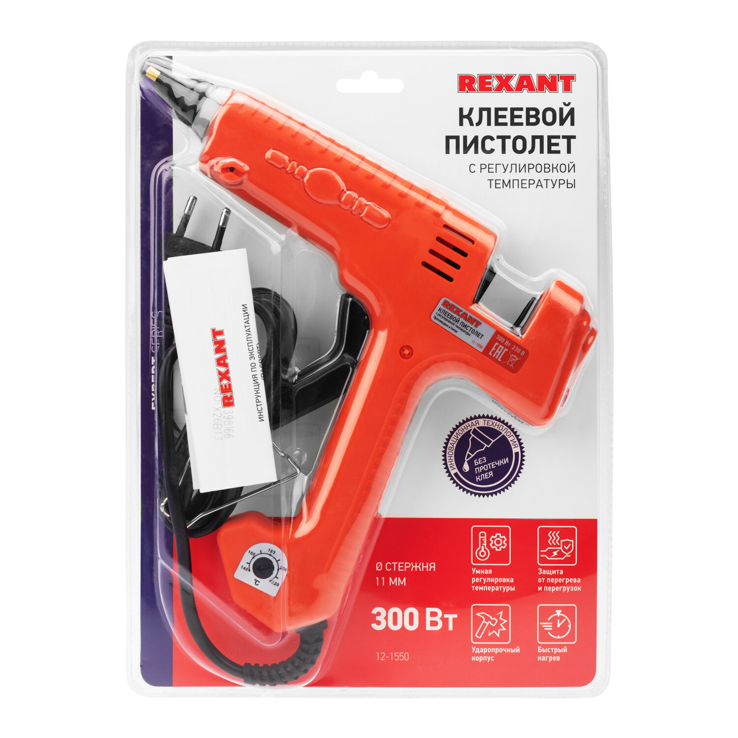 REXANT Пистолет клеевой , 300 Вт, ?11 мм, эксперт, настройка температуры 100…220?, блистер 12-1550