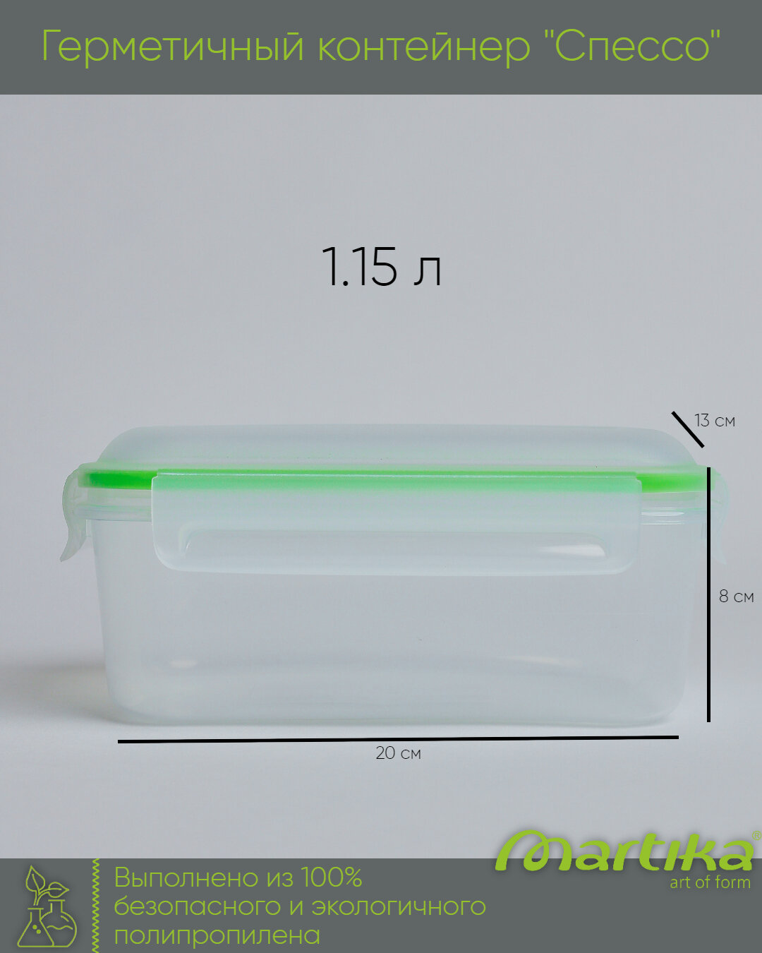 Контейнер пищевой Martika Спессо, прямоугольный, с крышкой, 19.6x13.4x8.4см, зеленый, 1.15л