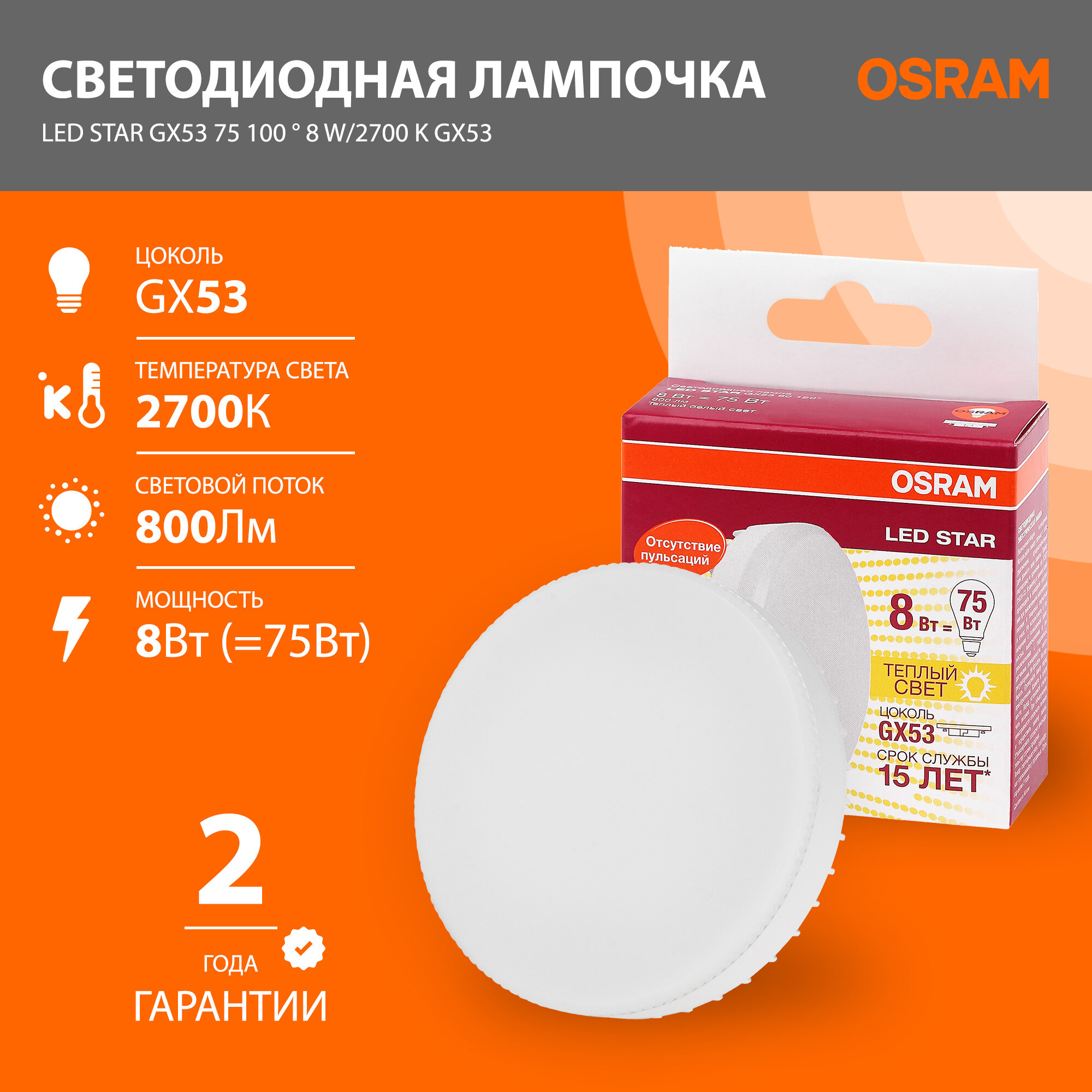 10шт/уп. Лампа LED Таблетка 8Вт 220-240V GX53 800Лм 2700К Угол 110 град. D-75mm L-22mm Свет Теплый белый OSRAM, уп. 10шт