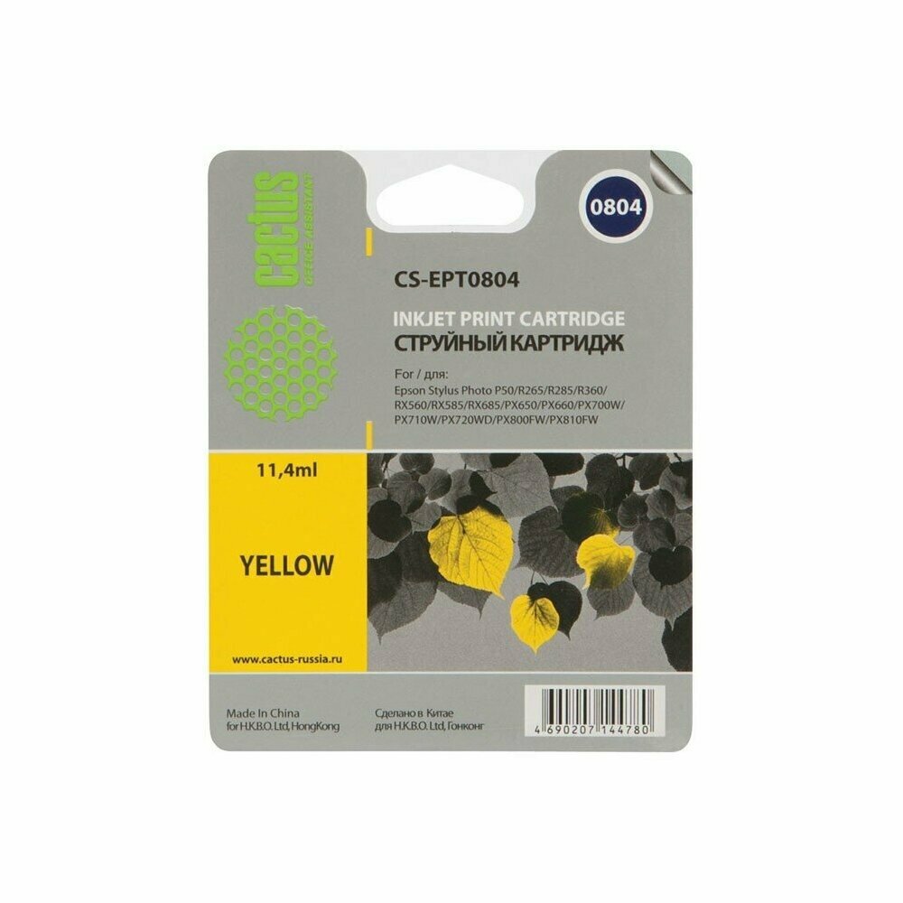 Картридж Cactus CS-EPT0804 T0804 желтый, для EPSON Stylus Photo P50/PX650/PX660/PX700/PX700W/PX710/PX710W/PX720/PX720WD/PX800/PX800FW/PX810/PX810FW/PX820/PX820FWD/R265/R285/R360/RX560/RX585/RX685