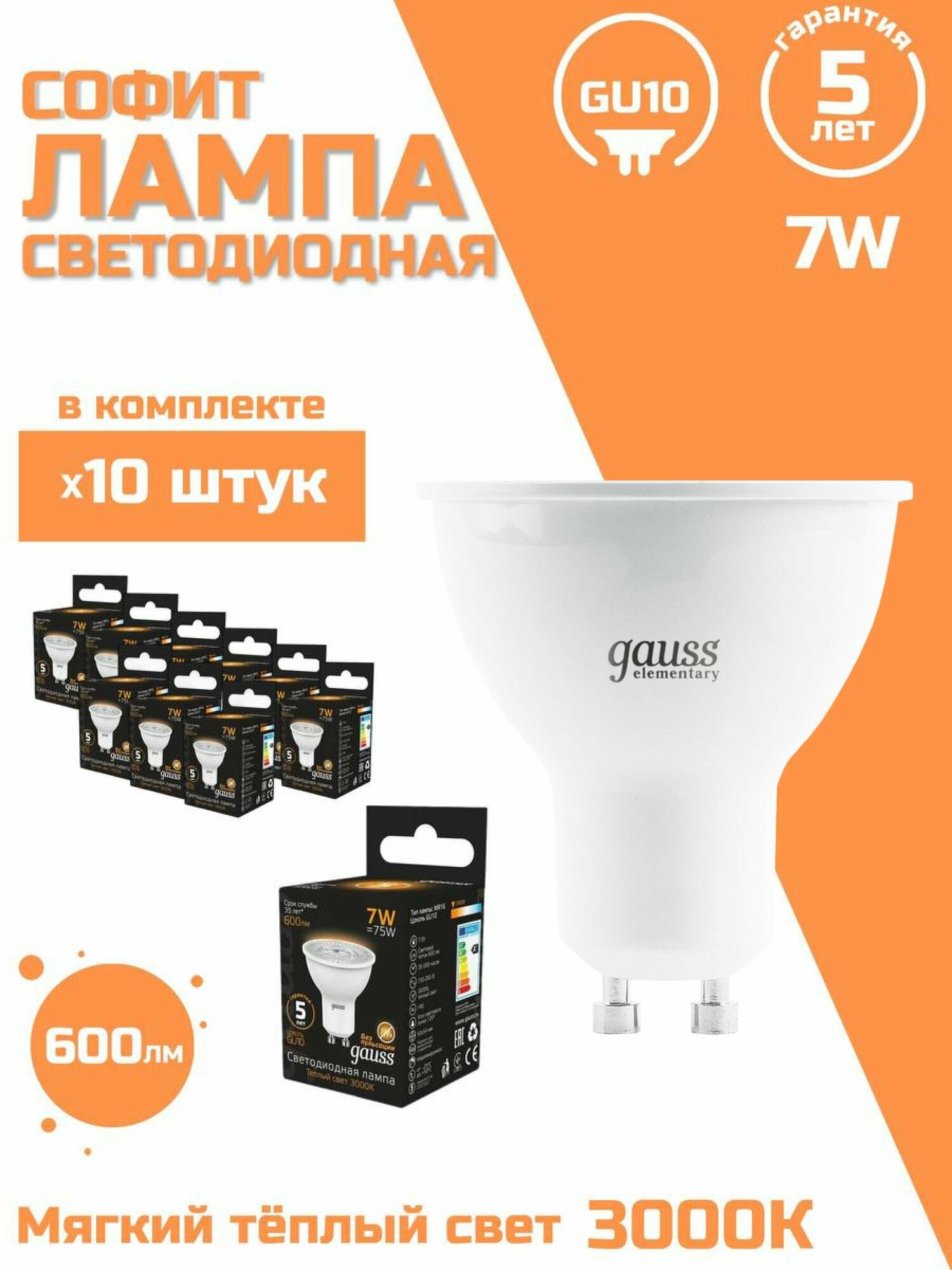 Упаковка ламп LED GAUSS GU10, рефлектор, 7Вт, 3000К, белый теплый, 10 шт. [101506107]