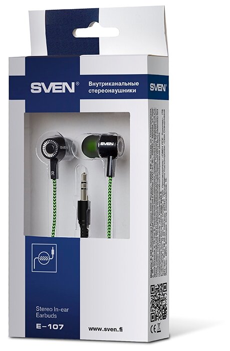 Наушники SVEN E-107, черный-зеленый, внутриканальные стерео 1573802 SV-015404