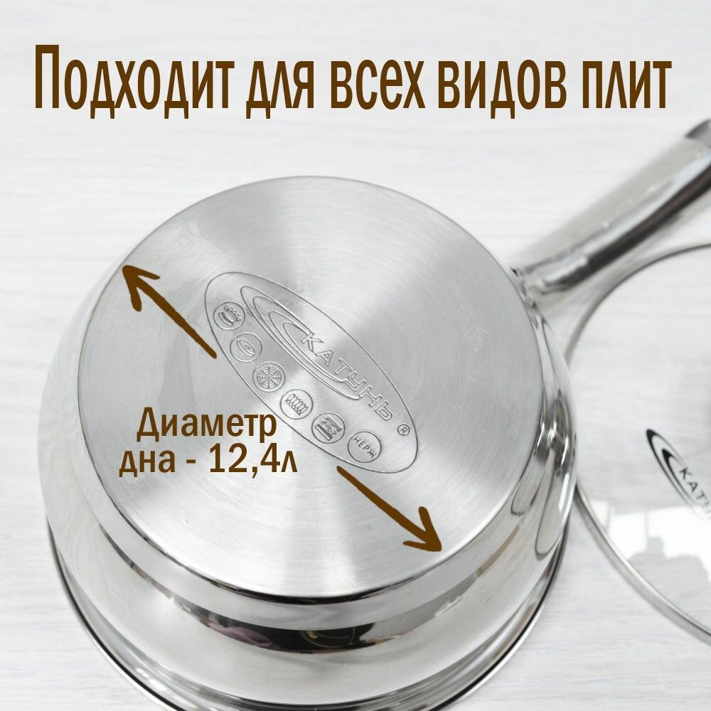 Ковш кухонный Катунь Гретта КТ04-К с крышкой, из стали, хром, 1.6л / ковшик для всех видов плит / посуда для кухни