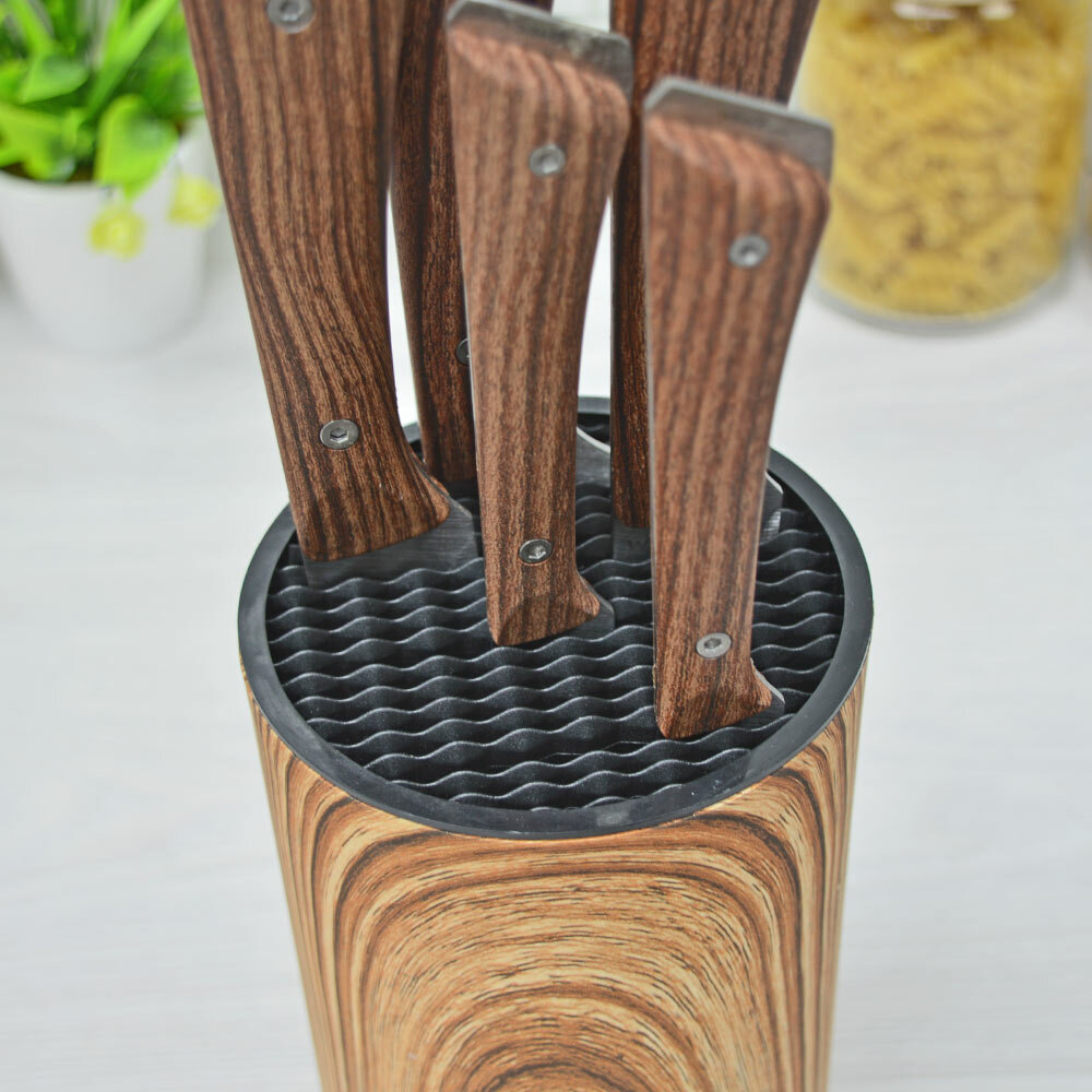| Комплектация | -нож поварской(34,2/20,3см); -нож для нарезки хлеба(35,5/20,4см); -нож для тонкой нарезки (34,5/20,4 см); -нож универсальный(24,8/12,5см); -нож для очистки(21/8,7см); -точилка для ножей(длина 30,3см); -подставка. |
