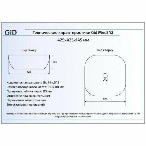 Накладная раковина Gid Mnc542 42.5х42.5 под камень 54446