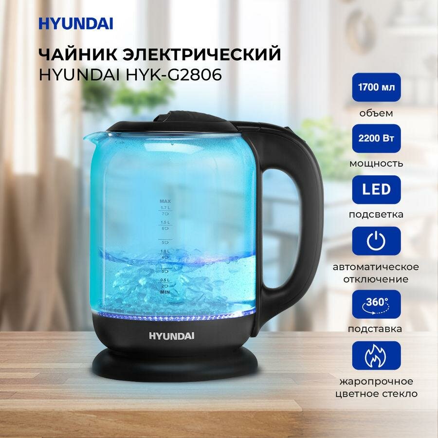 Чайник HYUNDAI HYK-G2806 2200Вт 1,8л стекло черный/голубой
