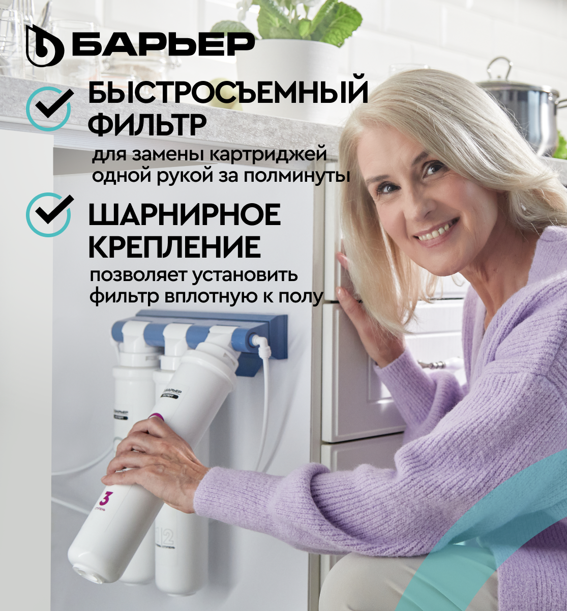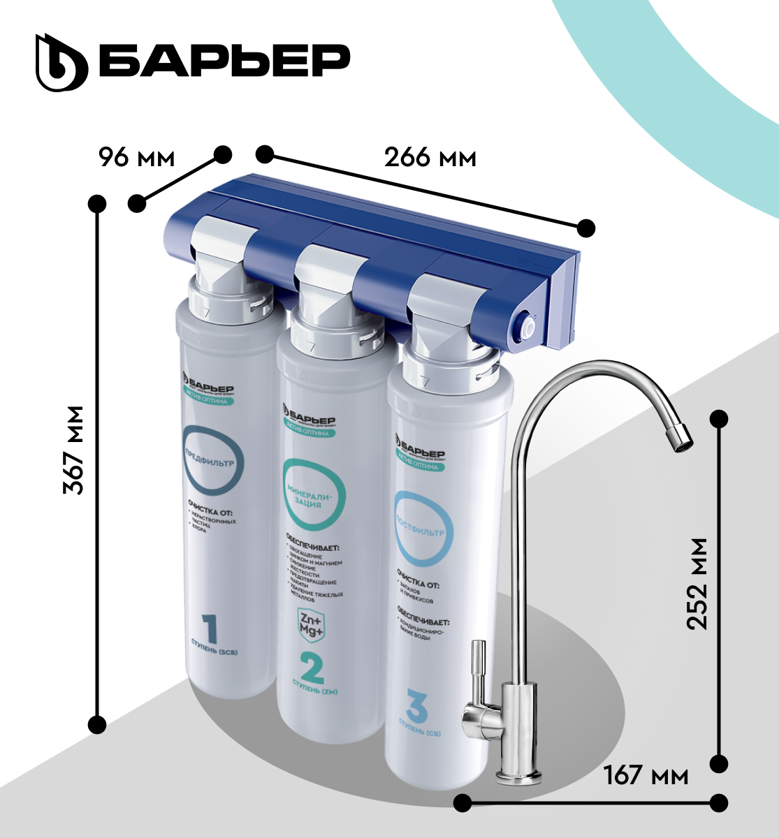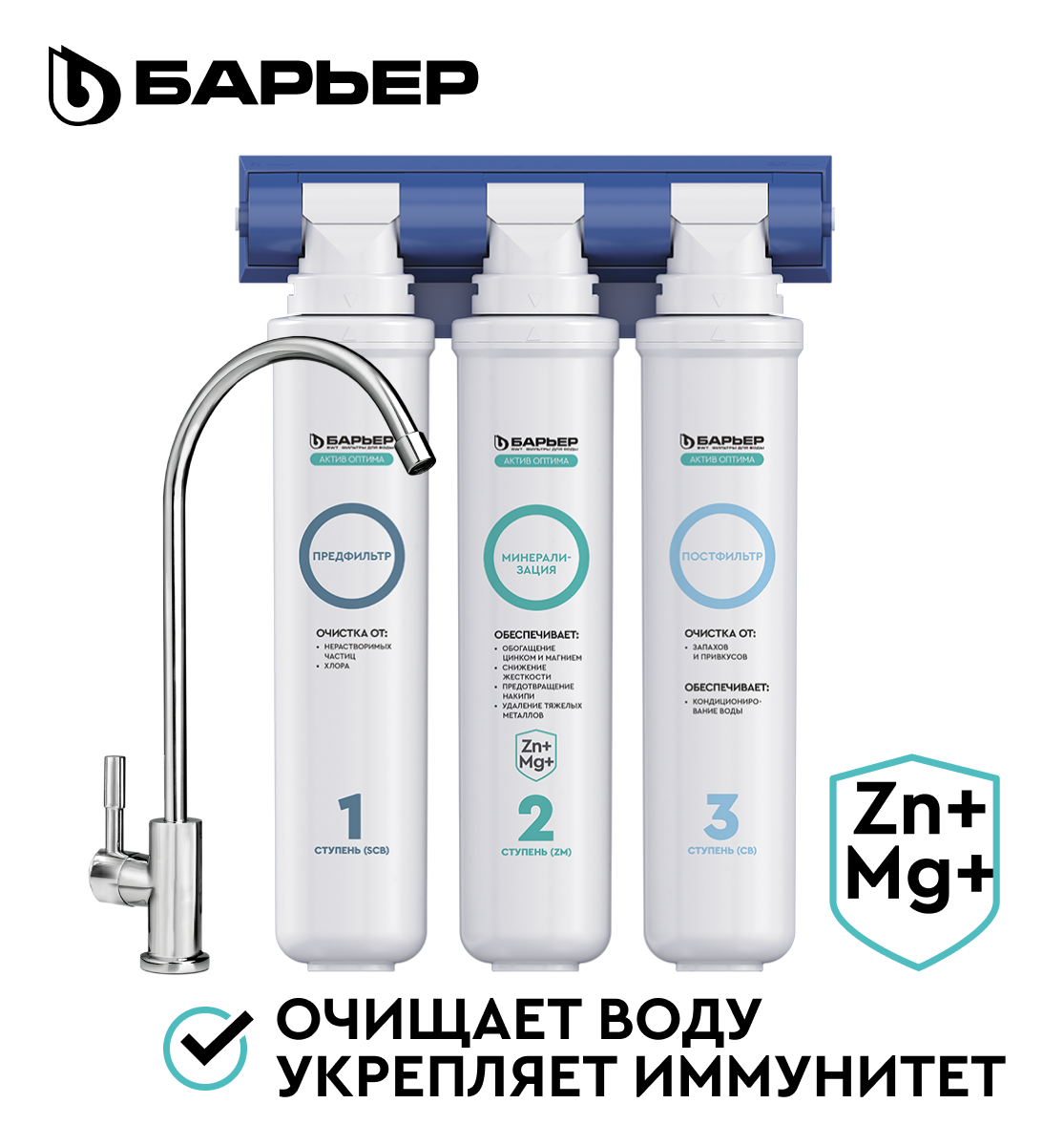 Фильтр под мойку для очистки воды трехступенчатый, быстросъемный БАРЬЕР Актив Оптима Сила Иммунитета, обогащает цинком