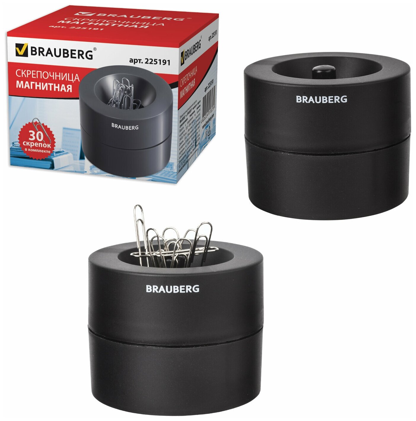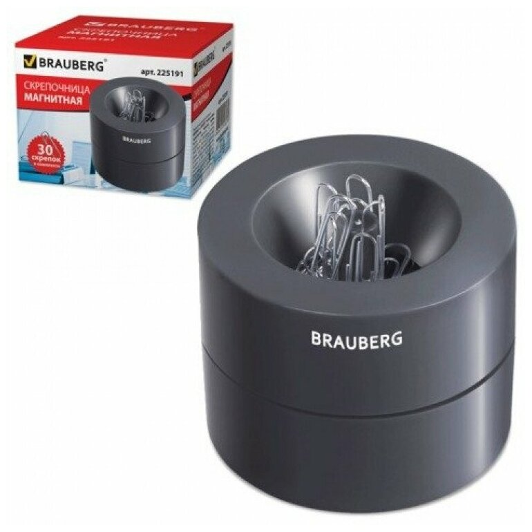 Скрепочница магнитная с 30 скрепками, большой бочонок, чёрная Brauberg 1930116 .