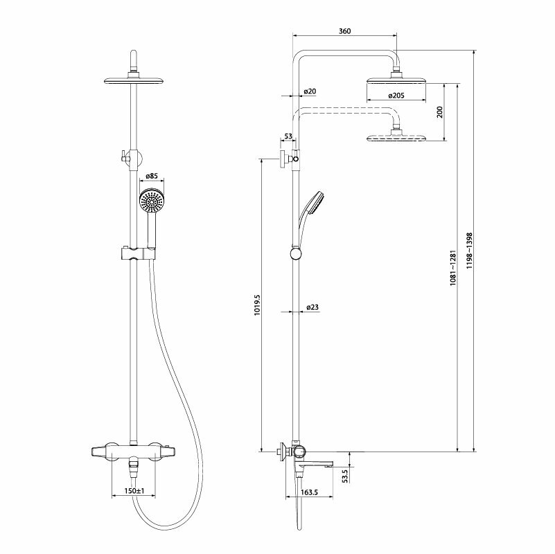 | Дополнительная информация | высота стойки для душа: 1398 мм; диаметр душевой лейки: 85 мм; диаметр верхнего душа: 205 мм |