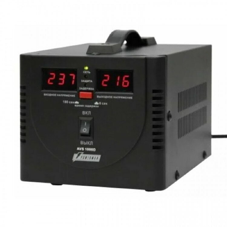 Стабилизатор POWERMAN AVS 1000D, черный, ступенчатый регулятор, цифровые индикаторы уровней напряжения, 1000ВА, 140-260В, максимальный входной ток 7А, 2 евророзетки, IP-20, напольный, 200мм х 150мм х 140мм, 2,3 кг./ Stabilizer POWERMAN AVS 1000D, black, s