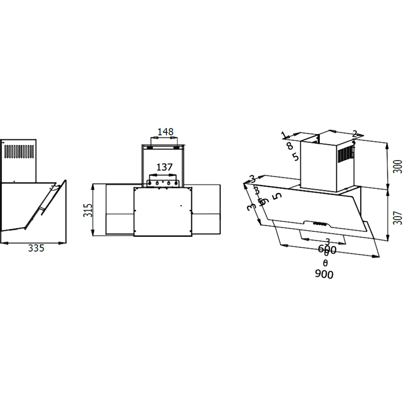 EVELUX Вытяжка наклонная EVELUX вытяжка, 60 см, механический контроль, 3 скорости работы, производительность 900 м3/ч, LED освещение, черный, металл, стекло, 600х335х395-607 мм.