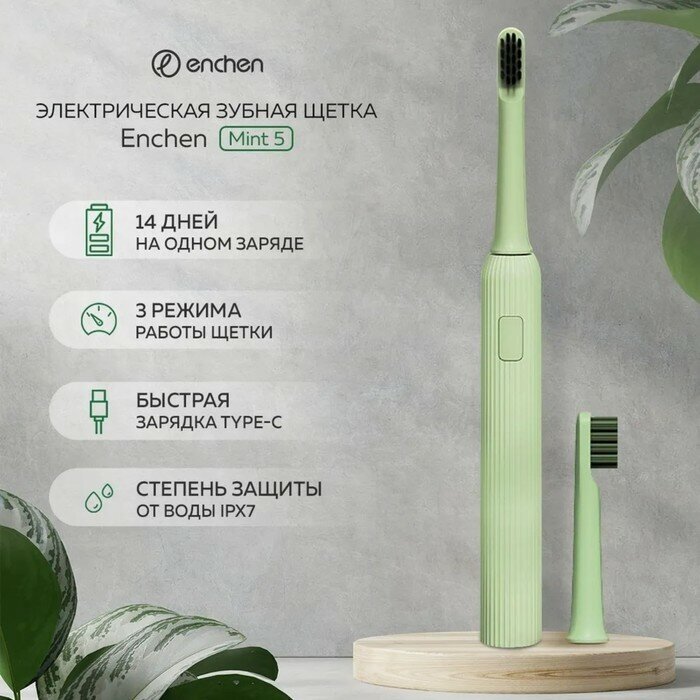 Электрическая зубная щетка Enchen Mint 5 (Green) IPX7 для полости рта и брекетов/ 3 режима / таймер
